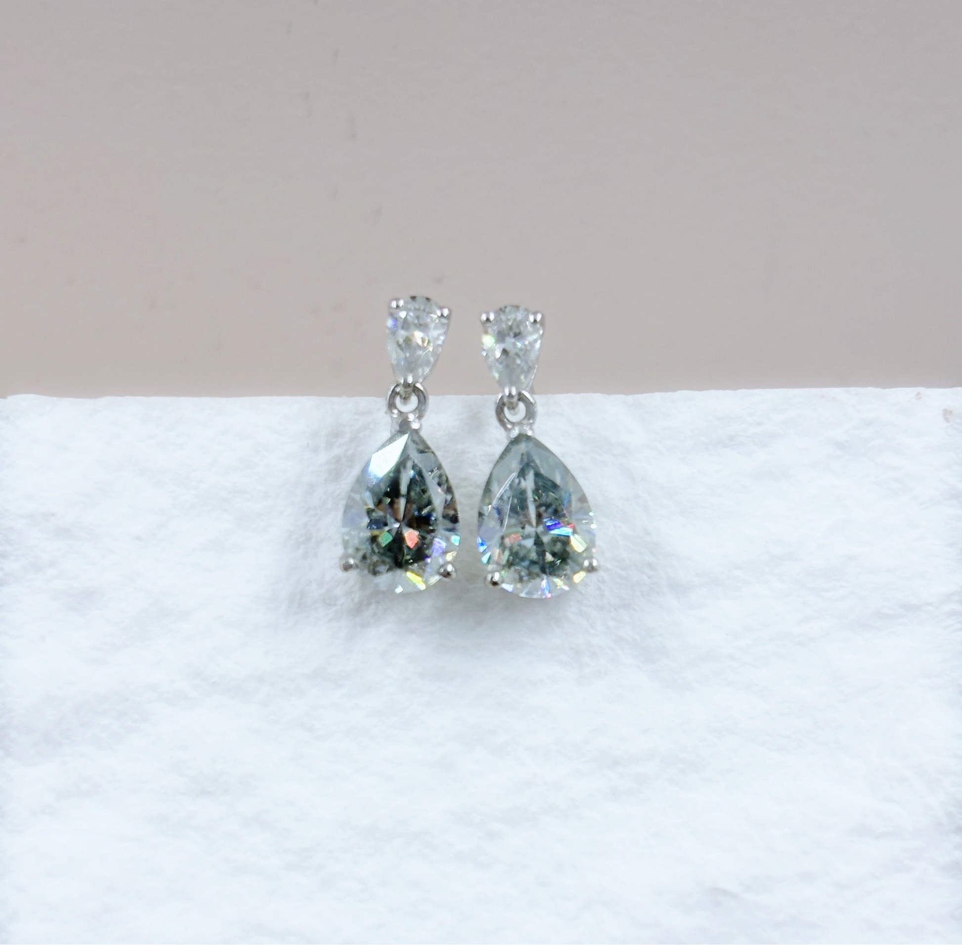 This piece has charmed the hearts of many. Instead of the usual round gem for the stud, I’ve chosen a small downturn pear, adding a delicate touch that, together with the drop, forms the silhouette of an hourglass.