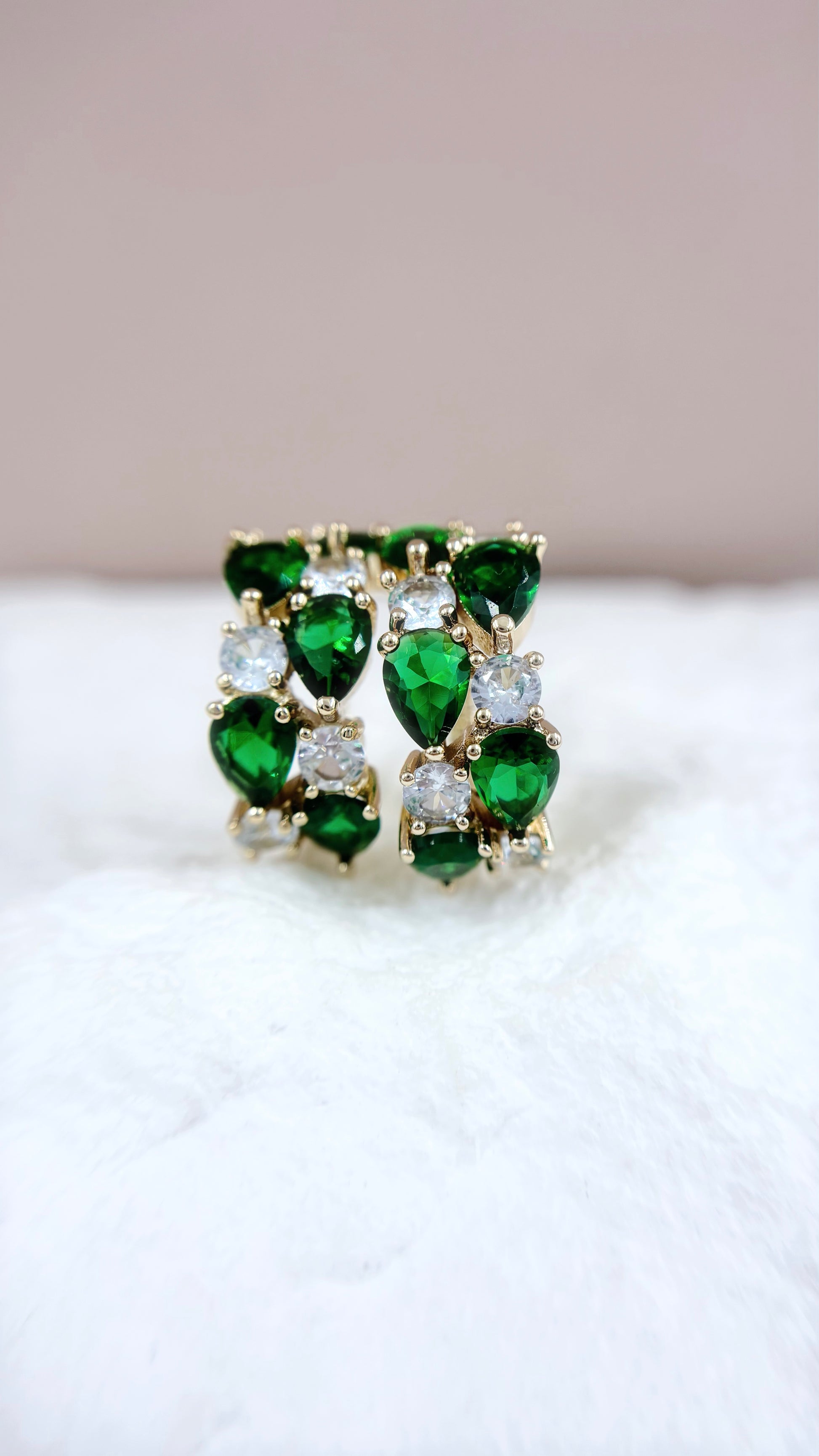 Multi Gem Ear Hoops - Emerald Green on Gold