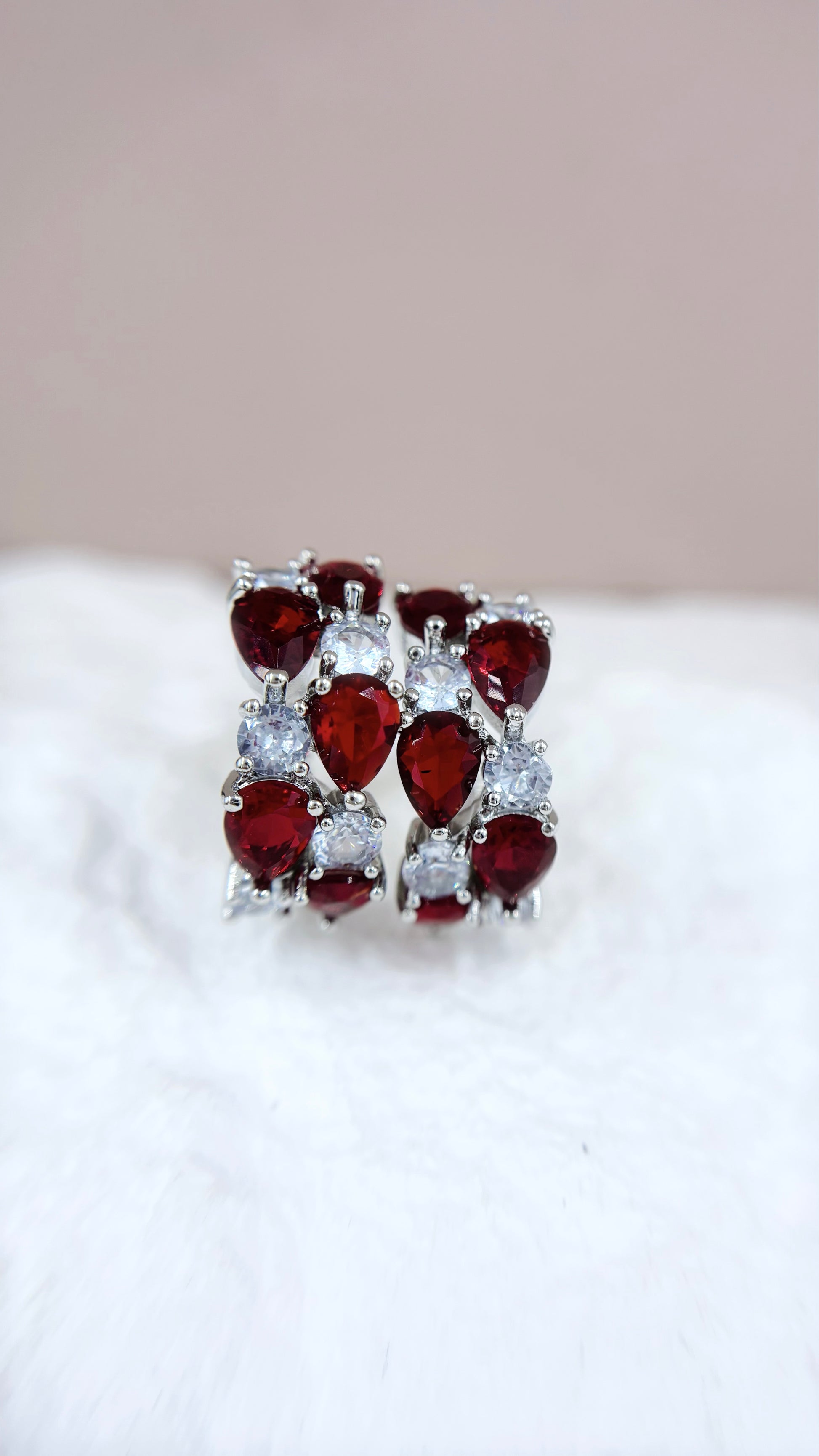 Ruby red + White gems on 18K white gold vermeil.